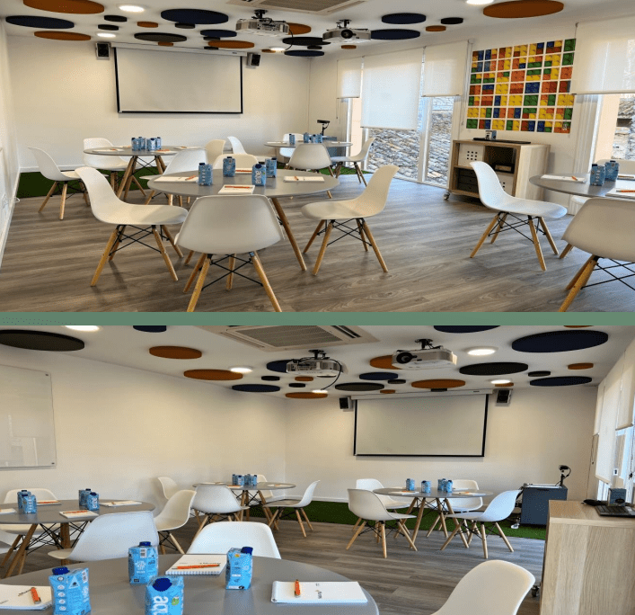 Sala completa, ideal para reuniones, exposiciones y trabajo en grupos